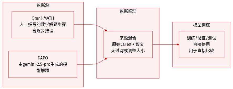 • 作者使用了人类撰写与模型生成的数学问题解法的混合数据,主要来源于两个数据集:Omni-MATH(人类解法)和 DAPO(由 gemini-2.5-pro 生成的解法)。