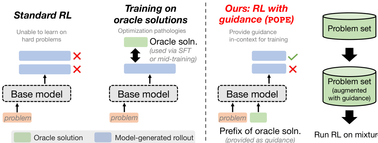 作者利用强化学习提升大语言模型在困难问题上的推理能力,但标准策略梯度强化学习在此类任务中通常失败,因为极少能采样到任何正确的轨迹——导致无学习信号。先前的改进方法,如熵奖励、pass@k 优化或混合易/难问题训练,均未奏效:它们要么破坏训练稳定性,要么因“射线干扰”(即优化聚焦于已可解任务)而降低性能。作者的主要贡献是“特权策略梯度探索”(POPE),该方法在强化学习过程中使用人类或“神谕”所写解法的短前缀引导探索——但从未训练模型去模仿这些前缀。这使得模型能在困难问题上采样到成功的轨迹,且所学行为可通过指令遵循和回溯机制迁移到无引导设置中,从而显著扩大可解问题的范围。