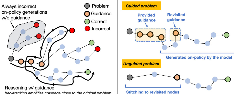 如下图所示,大语言模型中的推理轨迹常包含自我验证与回溯行为,从而扩大了初始问题附近的可达状态范围。当这些行为在引导下发生时,会诱导引导与无引导状态空间的重叠。这种重叠使所学策略能从引导式成功泛化到无引导前缀,实质上将探索问题简化为到达任何邻近状态,而非复现完整引导字符串。