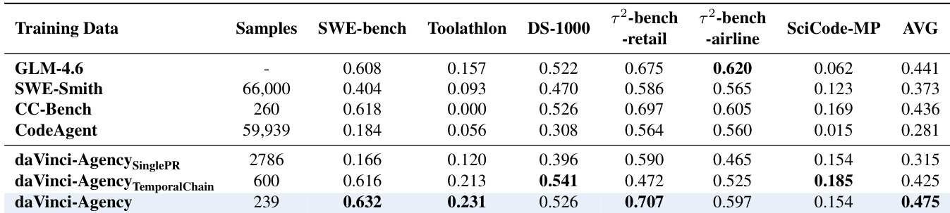 • daVinci-Agency在长视野代理基准测试中优于主要开源基线,尤其在软件工程、工具使用与跨领域可靠性方面表现突出,尽管数据量更小。