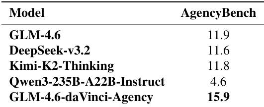 作者使用daVinci-Agency微调GLM-4.6,在AgencyBench衡量的长视野代理任务中获得显著性能提升。结果表明,微调模型显著优于其基础版本及其他大规模基线(如DeepSeek-v3.2与Kimi-K2-Thinking)。该提升归因于从真实PR演进中提取的结构化监督,而非依赖更强教师模型或简单数据扩展。
