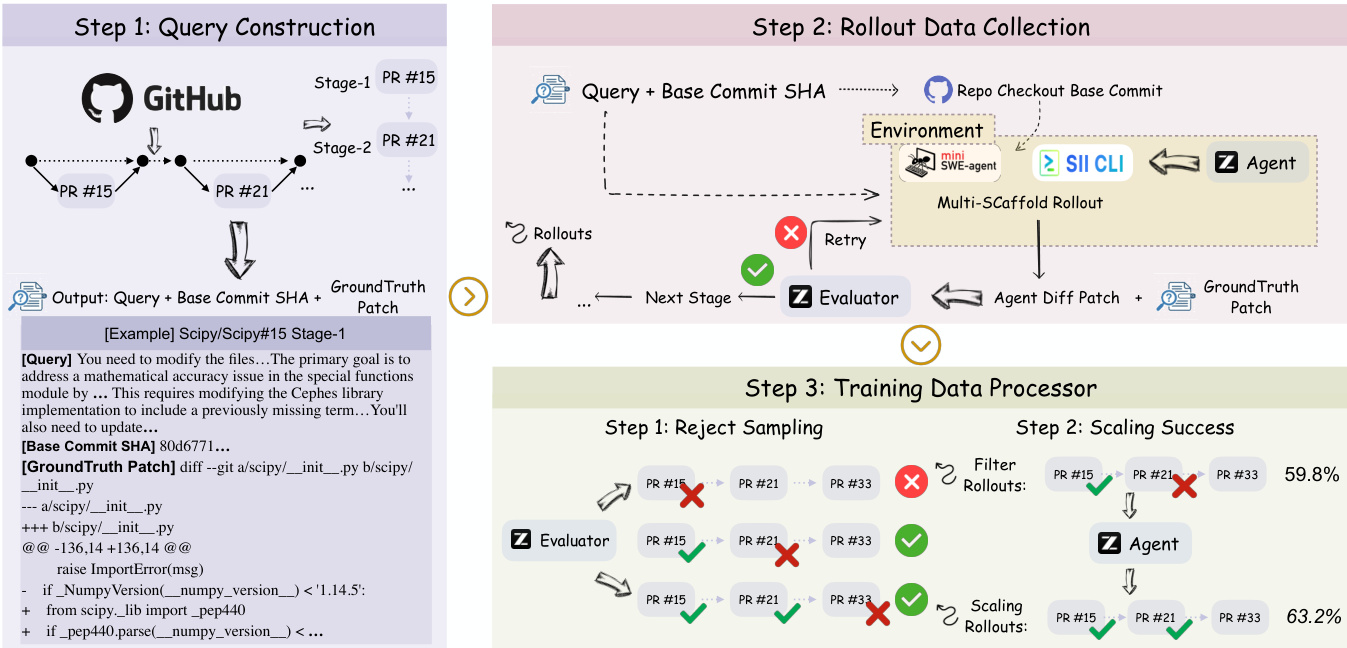 参考框架图说明端到端流程:从PR链构建查询开始,经状态传播环境下的多阶段执行数据收集,最终通过拒绝采样与缩放处理训练数据。环境通过递归将代理前一补丁应用于下一阶段的基提交来强制连续性,形式化为 Sinit(t)=BtΔτt1S_{\mathrm{init}}^{(t)} = B_t \oplus \Delta\tau_{t-1}Sinit(t)=BtΔτt1,确保每个后续任务均基于代理自身演进的代码库状态。这种递归依赖迫使代理维持长期一致性并管理各阶段的错误累积。