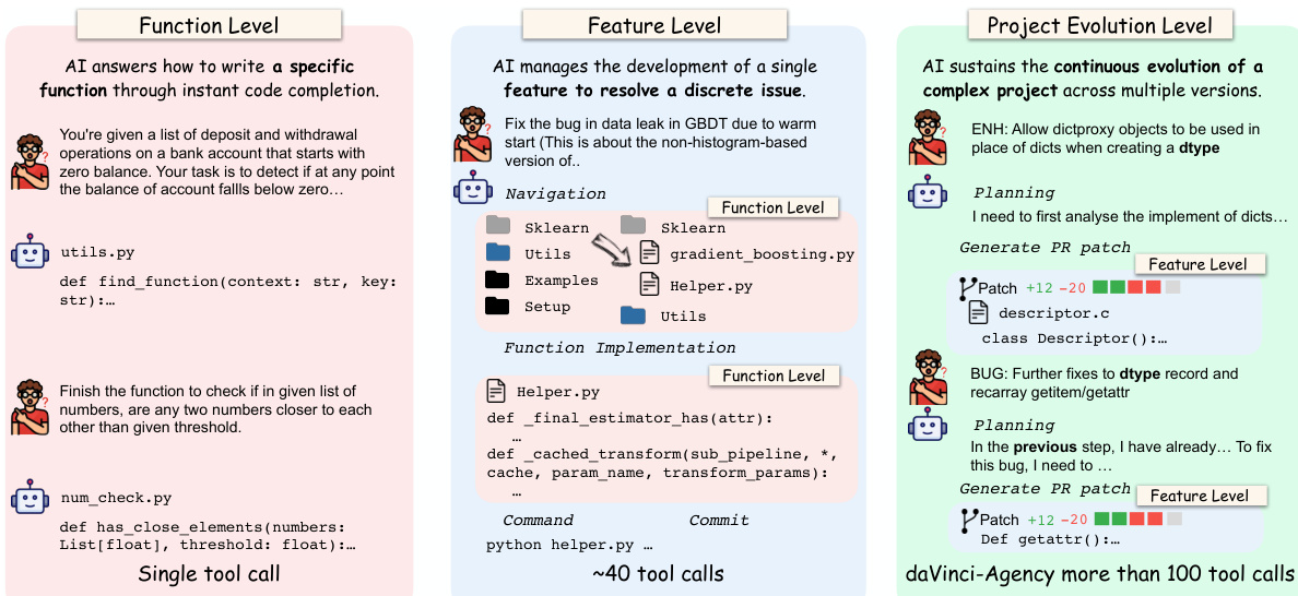 如下图所示,模型运行在三个不同视野层级:函数级(单次工具调用)、功能级(约40次工具调用)与项目演进级(100+次工具调用)。daVinci-Agency针对的项目演进级要求跨多个PR的持续规划、导航与迭代补丁生成,反映真实软件维护的复杂性。代理必须从补丁中抽象关键逻辑,合成结合意图、位置与实现策略的指令,并在各阶段保持状态。