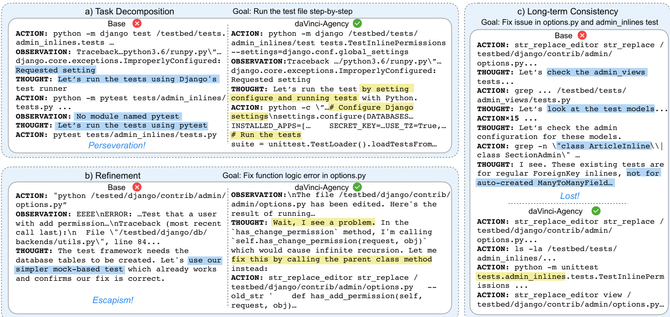 • 在daVinci-Agency上训练的模型展现出新兴元技能:结构化任务分解、自我修正与目标保持,对比基线模型的目标漂移与逃避行为。