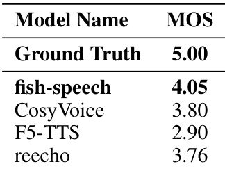 The authors conduct a subjective evaluation of synthesized audio quality using Mean Opinion Score (MOS) ratings. The results demonstrate that the proposed fish-speech model achieves higher perceptual quality scores compared to the tested baseline models. Fish-speech outperforms baseline models like CosyVoice, F5-TTS, and reecho in subjective quality ratings The proposed method shows superior performance in terms of speech naturalness and speaker similarity The results indicate that the model better captures and reproduces natural human speech characteristics