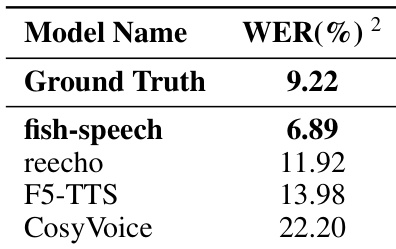 The authors evaluate the performance of the fish-speech model in voice cloning tasks by measuring the Word Error Rate. The results demonstrate that the proposed model achieves higher intelligibility compared to several baseline models. The fish-speech model achieves a lower word error rate than all listed baseline models The model's performance in terms of content fidelity even surpasses the ground truth recordings The proposed methodology shows a significant improvement in synthetic stability over competing models