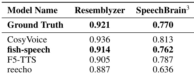 The authors evaluate speaker similarity across different models using Resemblyzer and SpeechBrain metrics. The results demonstrate that the proposed fish-speech model closely approximates the ground truth performance in both evaluation frameworks. The fish-speech model achieves speaker similarity scores that are remarkably close to the ground truth. The proposed method outperforms baseline models such as F5-TTS and reecho in capturing speaker characteristics. Consistent performance across both evaluation metrics validates the model's ability to preserve speaker identity.