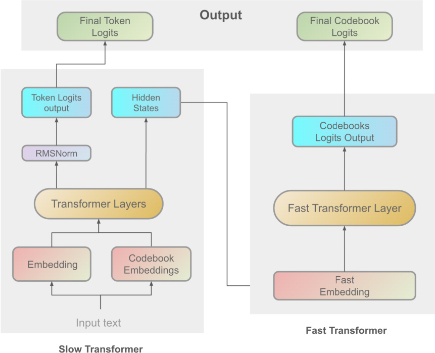 where Norm()\text{Norm}(\cdot)Norm() represents layer normalization and Wtok\mathbf{W}_{\text{tok}}Wtok denotes the learnable parameters of the token prediction layer. Following this, the Fast Transformer refines the output by processing detailed acoustic features. It takes a concatenated sequence of the hidden states h\mathbf{h}h and codebook embeddings c\mathbf{c}c as input: