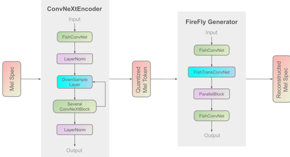 The speech synthesis is completed by the Firefly-GAN (FF-GAN) vocoder. This component improves upon traditional architectures by replacing the Multi-Receptive Field (MRF) module with a ParallelBlock, which utilizes a stack-and-average mechanism and configurable convolution kernel sizes. The internal structure of the FireFly Generator is illustrated below: