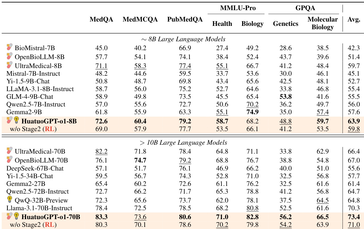 The authors evaluate various large language models on medical benchmarks, showing that their model, HuatuoGPT-o1, achieves strong results across multiple datasets. The 8B and 70B versions outperform other open-source models, particularly on challenging tasks requiring reasoning and medical knowledge. HuatuoGPT-o1 models outperform other open-source LLMs on most medical benchmarks The 70B version surpasses models specifically designed for advanced reasoning capabilities Performance improvements are attributed to a two-stage training strategy involving complex chain-of-thought and reinforcement learning