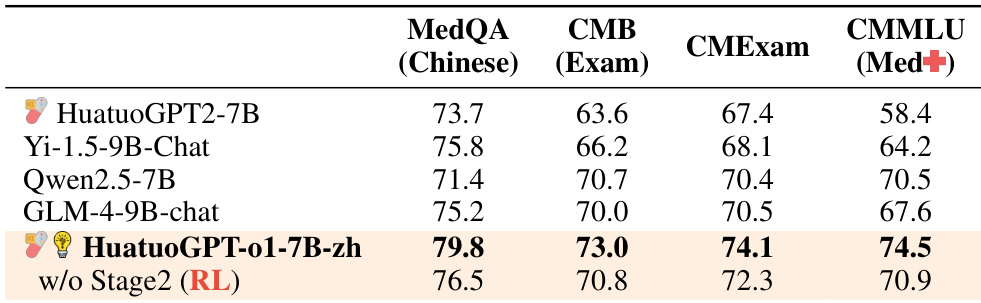 The authors evaluate HuatuoGPT-o1 across general and Chinese-specific medical benchmarks, demonstrating superior performance over existing open-source models particularly in reasoning-intensive tasks. Ablation studies confirm that these gains are driven by a two-stage training strategy combining Complex Chain-of-Thought reasoning with PPO-based reinforcement learning. Additionally, verifier comparisons indicate that GPT-4o maintains higher accuracy than fine-tuned alternatives, especially on challenging evaluation stages.