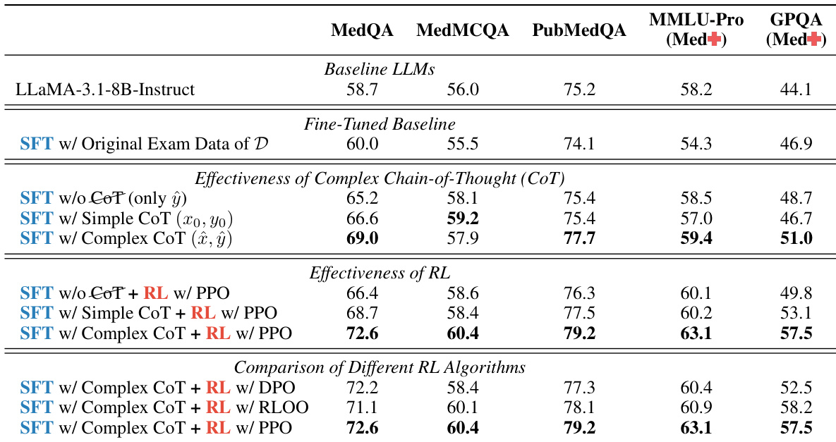 The authors conduct an ablation study to evaluate the effectiveness of different reasoning strategies and reinforcement learning algorithms on medical language models. Results show that Complex Chain-of-Thought reasoning and PPO-based reinforcement learning significantly improve performance compared to simpler methods. Complex CoT reasoning leads to substantial performance gains over simple CoT and direct learning PPO outperforms other reinforcement learning algorithms like DPO and RLOO The combination of Complex CoT and PPO yields the highest performance across all benchmarks