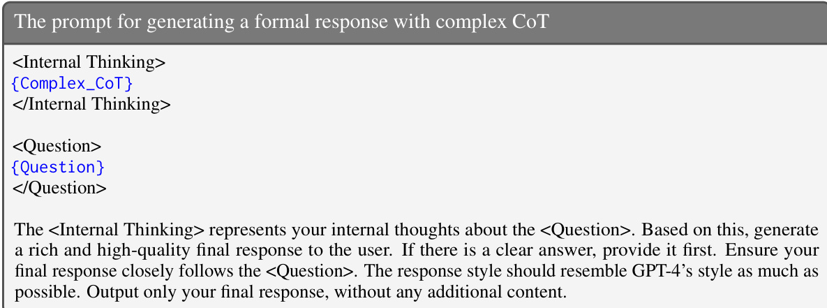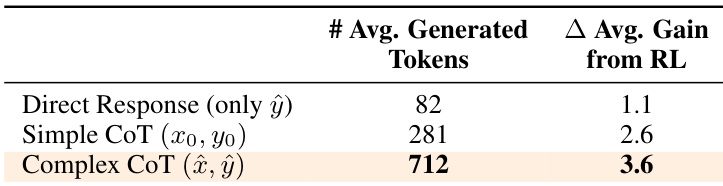 The the the table compares different reasoning strategies in terms of average generated tokens and performance gain from reinforcement learning. Results show that Complex CoT generates the most tokens and achieves the highest gain, indicating its effectiveness in enhancing model performance. Complex CoT generates significantly more tokens than other strategies. Complex CoT achieves the highest performance gain from reinforcement learning. Direct response results in the lowest token generation and minimal gain from reinforcement learning.
