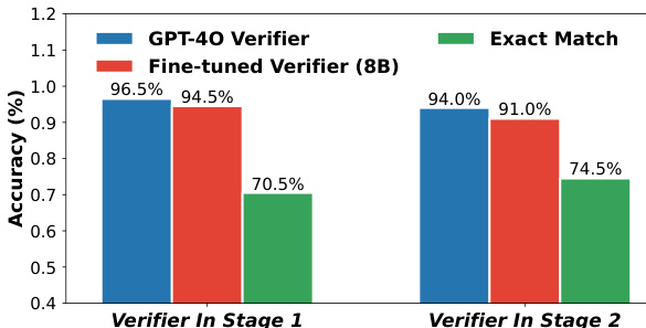 The authors compare the accuracy of two verifiers, GPT-4o and a fine-tuned 8B model, across two stages. Results show that GPT-4o achieves higher accuracy than the fine-tuned verifier in both stages, with a notable performance gap on the more challenging Stage 2 tasks. GPT-4o verifier outperforms the fine-tuned verifier in both stages The performance gap between the two verifiers widens in Stage 2 The fine-tuned verifier shows lower accuracy, particularly in Stage 2