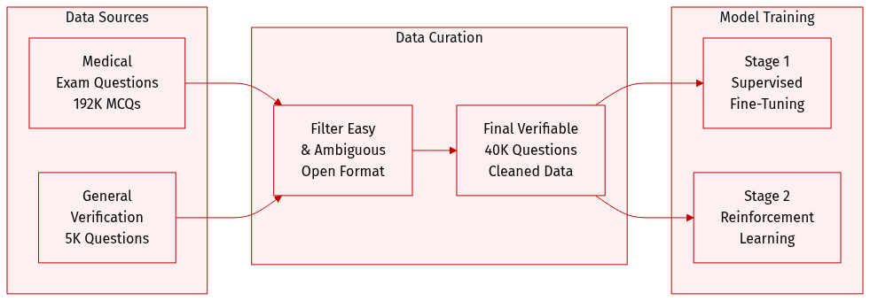 - The 40K medical questions are split evenly with 20K allocated for Supervised Fine-Tuning in Stage 1 and 20K for Reinforcement Learning in Stage 2.