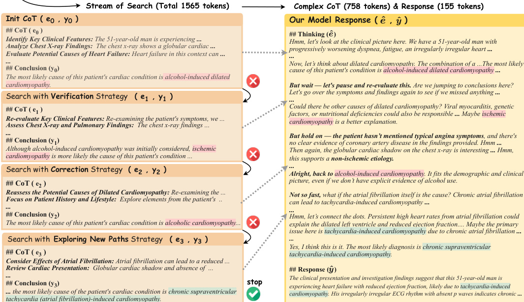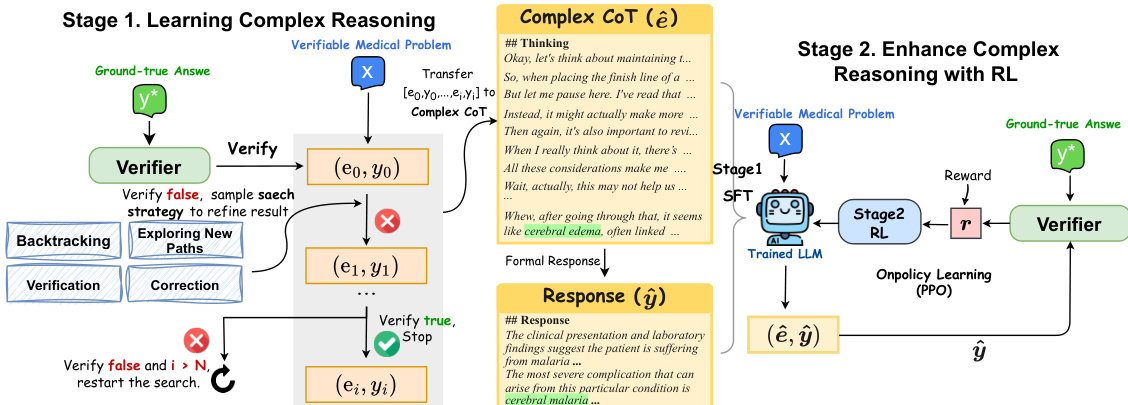 The process begins with the construction of verifiable medical problems, derived from closed-set question sets such as MedQA and MedMCQA. These problems are filtered and transformed into challenging, verifiable instances, each consisting of a question x and a ground-truth answer y∗. A medical verifier is employed to assess the correctness of model responses. The framework proceeds to Stage One, where the LLM is trained to generate complex reasoning trajectories. Given a problem x, an initial chain-of-thought (CoT) e0 and answer y0 are generated. The verifier checks if y0 matches y∗. If incorrect, the model iteratively refines the answer by applying one of four search strategies: exploring new paths, backtracking, verification, or corrections. This iterative search continues until the answer is verified as correct or a maximum number of iterations is reached. The successful reasoning trajectories are then reformatted into a coherent, natural language complex CoT (e^), which is used to train the model via SFT to produce a formal response (y^) for the question. This stage teaches the model to engage in deep, exploratory reasoning before providing a final answer.