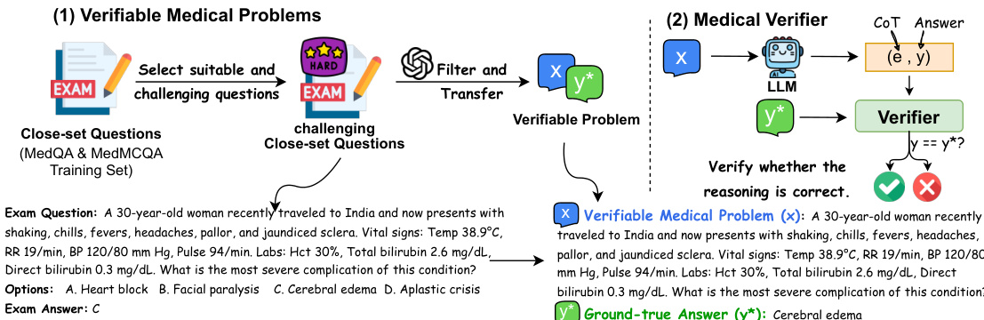 - This work introduces verifiable medical problems paired with a medical verifier to check the correctness of model outputs in a domain where verification is typically challenging. The proposal addresses the difficulty of verifying medical reasoning compared to mathematical tasks.
