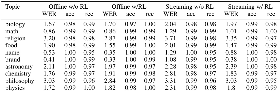 The authors evaluate Fun-ASR’s hotword customization performance across multiple technical domains, showing that reinforcement learning consistently improves recall and accuracy, especially for challenging topics like names and biology. Results indicate that RL enables the model to better recognize domain-specific terms even when they are not explicitly listed as hotwords, reducing word error rates across both offline and streaming settings. While minor trade-offs appear in some domains like philosophy, the overall recognition performance still improves with RL.
