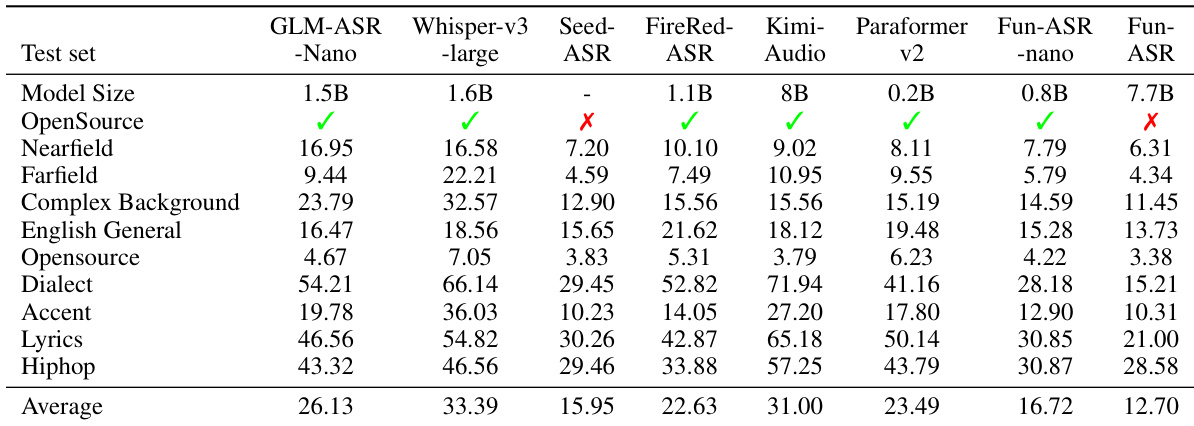 - Fun-ASR-nano, with only 0.8B parameters, closely matches larger models like Seed-ASR, demonstrating strong efficiency.