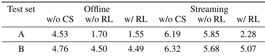 The authors evaluate the impact of reinforcement learning (RL) and code-switching (CS) training on ASR performance across two test sets, showing that RL consistently reduces WER in both offline and streaming modes. Results indicate that RL provides more substantial gains than CS, particularly in streaming scenarios, and that combining both techniques yields the best overall performance. The improvements suggest RL helps the model better handle sequential prediction challenges and reduce errors in real-time decoding.