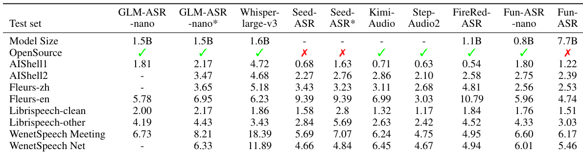 The authors evaluate multiple ASR models on open-source benchmarks, finding that while some open-source systems achieve low WER, their performance does not consistently translate to real-world industrial datasets. Fun-ASR outperforms both open-source and commercial models across these evaluations, with Fun-ASR-nano delivering competitive results despite its smaller parameter count. Results confirm that evaluation on open-source data alone may not reflect real-world robustness, underscoring the need for updated, industry-relevant test sets.