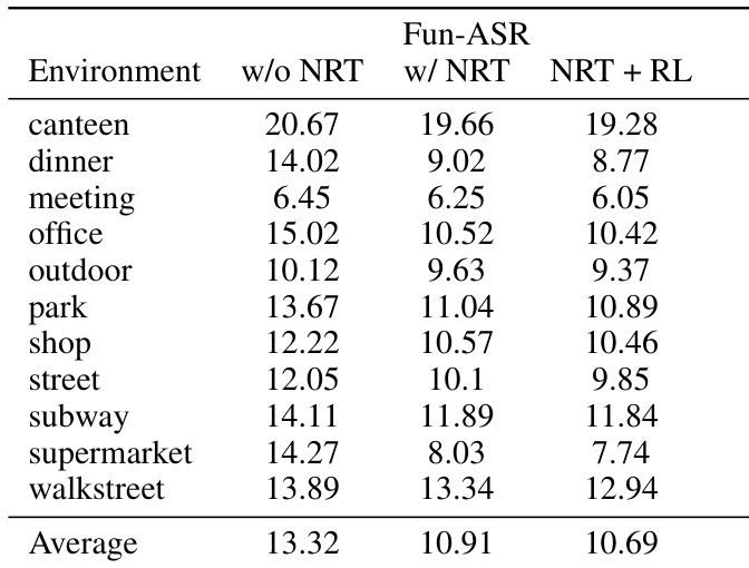 The authors evaluate Fun-ASR under various noisy environments, showing that noise robust training significantly reduces word error rates, especially in challenging settings like dinner and supermarket scenes. Adding reinforcement learning further improves performance in most conditions, though it slightly increases error in a few cases like walkstreet. Results confirm that combining noise robust training with reinforcement learning yields the best overall noise robustness.