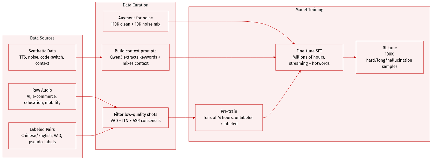 For supervised fine-tuning (SFT), they assemble millions of hours from human-transcribed, pseudo-labeled, environmental noise, TTS-synthesized (CosyVoice3), simulated streaming, noise-augmented, and hotword-customized data.