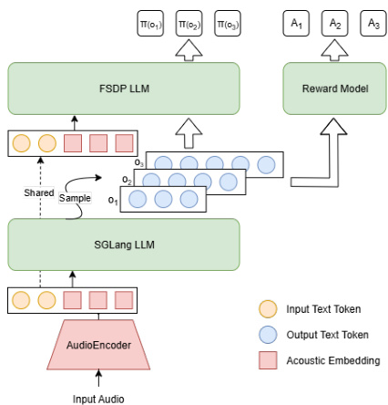 For reinforcement learning, the authors introduce FunRL, a scalable framework tailored for large audio-language models. As depicted in the figure below, FunRL orchestrates the audio encoder, rollout, and policy modules using Ray to alternate GPU usage efficiently. The audio encoder processes batches of input audio to extract embeddings, which are then transferred to CPU. The SGLang-based LLM rollout generates multiple hypotheses, each assigned a reward via a rule-based value function. The FSDP-based policy model then computes output probabilities and performs policy optimization via RL, with the updated policy synchronized back to the rollout module to maintain on-policy training.