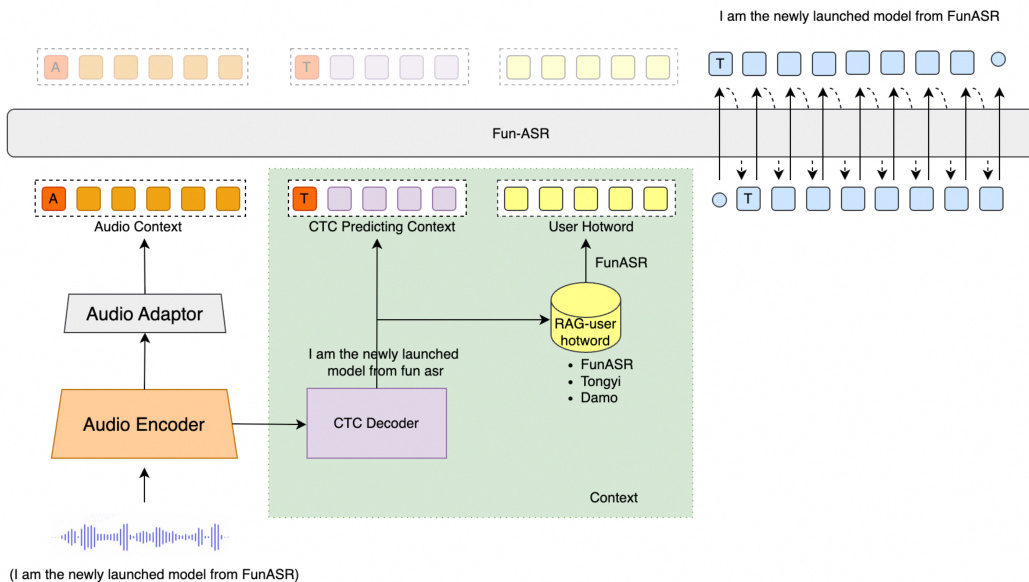 The audio encoder, implemented as a multi-layer transformer, processes raw speech input to extract high-level acoustic representations. These representations are then passed through a two-layer transformer-based audio adaptor, which aligns the acoustic features with the semantic space of the LLM. The CTC decoder, built atop the audio encoder, generates an initial recognition hypothesis via greedy search. This hypothesis serves dual purposes: it provides a starting point for the LLM decoder and enables retrieval-augmented generation (RAG) for hotword customization. The LLM-based decoder, conditioned on both the audio context and the CTC prediction, produces the final transcription. Two model variants are proposed: Fun-ASR (0.7B audio encoder + 7B LLM) for high accuracy, and Fun-ASR-nano (0.2B + 0.6B) for resource-constrained environments.