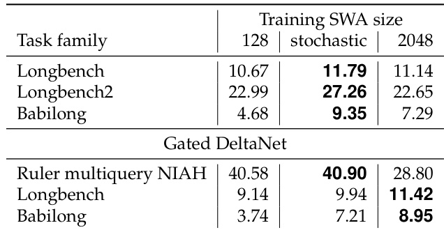 - Stochastic training (alternating 128/2048 windows, annealed in final 10%) achieves best of both worlds: matches or exceeds 2048-window models on short-context tasks while maintaining strong long-context performance (e.g., 16-point gain over 2048-window on average NIAH accuracy at 1.4B).