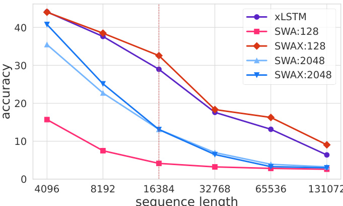 - SWAX introduces a hybrid architecture combining sliding-window softmax attention with xLSTM linear RNN layers, revealing that shorter attention windows unexpectedly improve long-context retrieval by compelling the model to rely more on the xLSTM’s persistent memory.