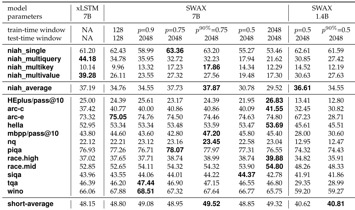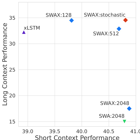 - Training SWAX with stochastically varying window sizes (e.g., 128/2048) bridges the gap between short- and long-context performance, significantly outperforming fixed-window baselines on benchmarks including RULER Needle-In-A-Haystack and perplexity tasks.