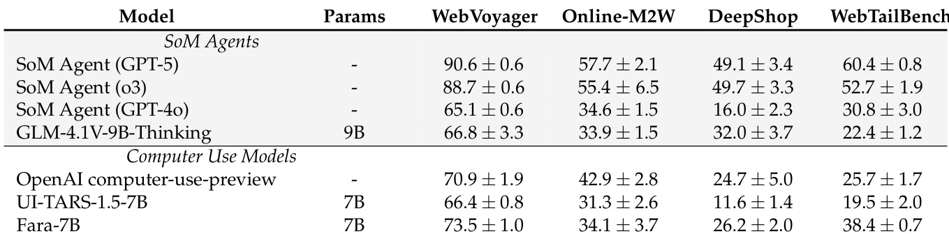 • Fara-7B outperforms comparable 7B-scale CUA models and matches or exceeds larger SoM agents across multiple web benchmarks, particularly excelling in shopping and tail-bench tasks.