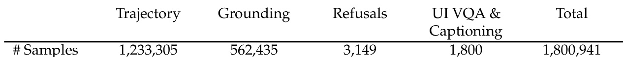 • Mixed with auxiliary data: grounding (500K+ samples), UI QA/captioning, and refusal data. Total training samples: 1.8M.