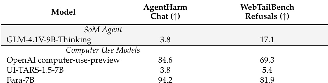 Fara-7B demonstrates significantly stronger safety performance than other computer-use models, achieving the highest refusal rates on both AgentHarm-Chat and WebTailBench-Refusals benchmarks. It outperforms the OpenAI computer-use-preview model and UI-TARS-1.5-7B by wide margins, indicating its training effectively instills robust refusal behavior for harmful tasks. The results highlight Fara-7B’s ability to prioritize user safety while maintaining functional capabilities.
