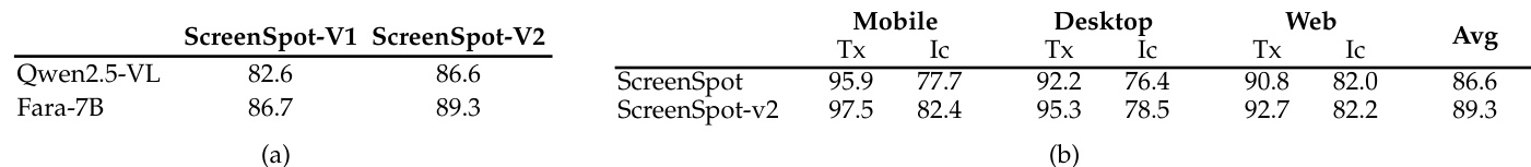 Fara-7B demonstrates improved grounding performance over its base model Qwen2.5-VL, achieving higher accuracy on both ScreenSpot-V1 and ScreenSpot-V2 benchmarks. It shows strong localization capabilities across mobile, desktop, and web interfaces, particularly excelling in text element grounding while maintaining solid performance on icon/widget identification. These results indicate that Fara-7B’s training enhances its ability to accurately perceive and interact with diverse UI elements, supporting its use as a reliable computer-use agent.