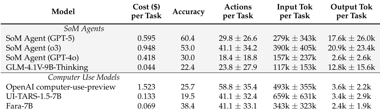 Fara-7B achieves higher accuracy than other 7B-scale computer-use models while costing significantly less per task, demonstrating a favorable cost-accuracy trade-off. It uses fewer output tokens than larger SoM agents, contributing to its efficiency, despite requiring a similar number of actions and input tokens. The model also shows competitive performance against more expensive proprietary systems, particularly in cost-sensitive deployment scenarios.
