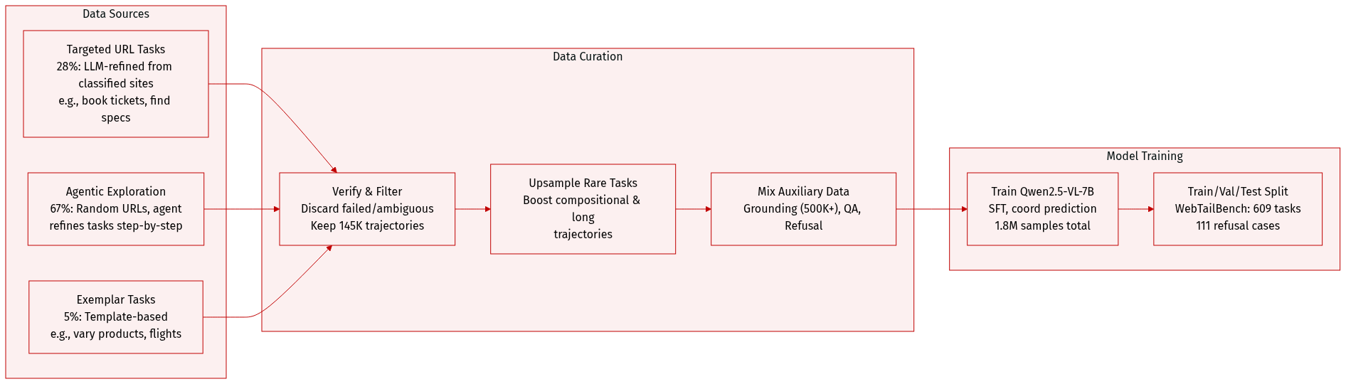 • Verification agents filter successful trajectories; failed or ambiguous tasks are discarded.