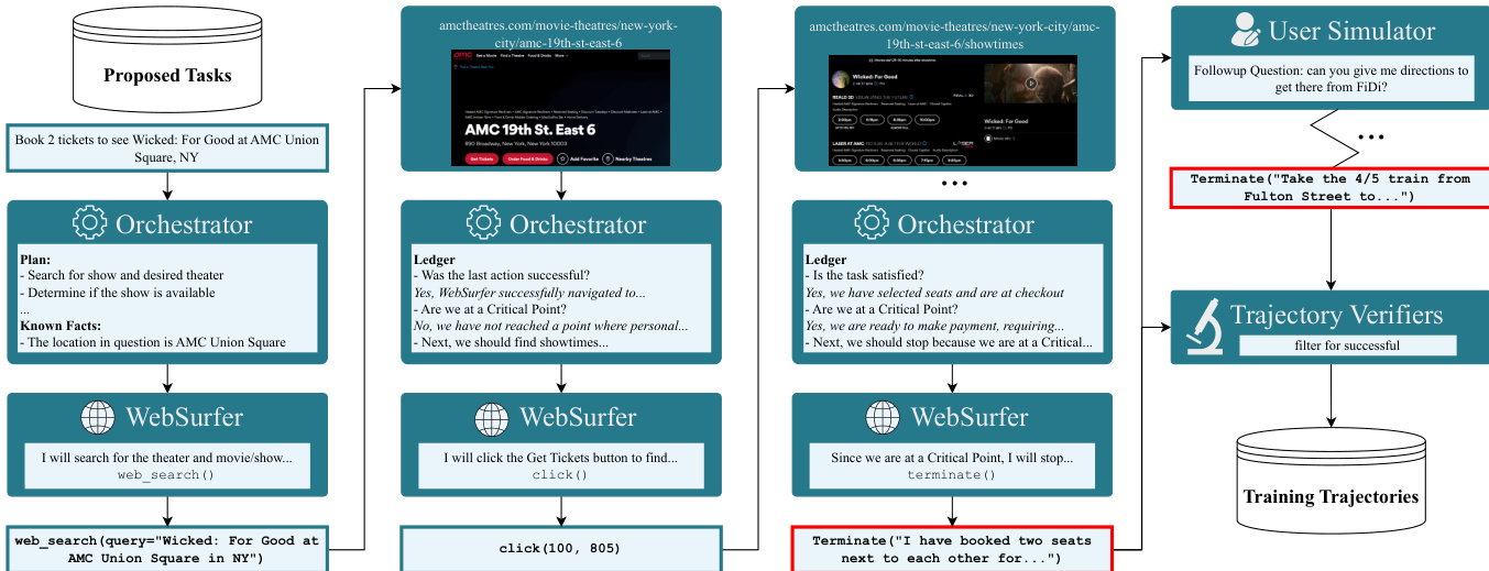 The authors leverage a multi-agent system built on Magentic-One to generate high-quality demonstration trajectories for supervised fine-tuning. This system centers around two core agents: the Orchestrator and the WebSurfer, which operate in a tightly coupled loop to solve synthetic web tasks. The Orchestrator is responsible for high-level planning, progress monitoring, and enforcing safety constraints—particularly around critical points—while the WebSurfer executes low-level browser actions based on the Orchestrator’s directives. Refer to the framework diagram below, which illustrates the iterative interaction between these agents, the role of the UserSimulator in multi-turn task extension, and the final filtering through trajectory verifiers before trajectories are stored for training.