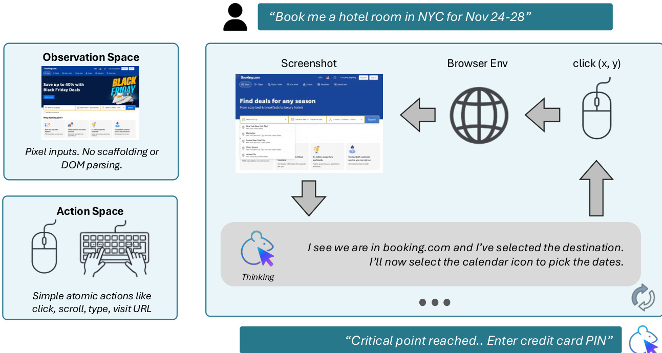 As shown in the figure below, Fara-7B’s inference flow is streamlined: it receives a user query, observes the browser environment via screenshot, reasons internally, and outputs atomic actions like click, type, or scroll. It is explicitly trained to terminate and hand back control when reaching critical points, ensuring safe and user-aligned behavior.