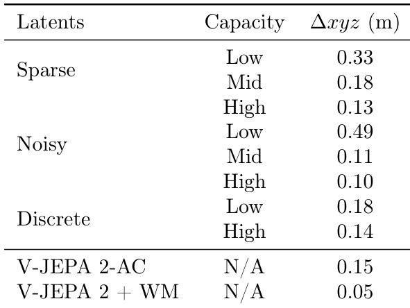The authors evaluate the planning performance of latent action models with varying capacities on robotic manipulation tasks, measuring the error in cumulative displacement. Results show that models with high capacity latent actions achieve lower error, with the V-JEPA 2 + WM model achieving the best performance at 0.05 meters.
