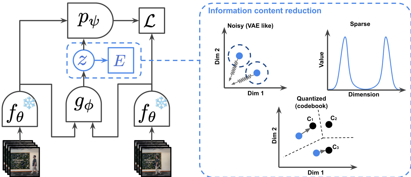 To ensure the latent action zt contains only the necessary information for prediction and avoids encoding extraneous noise or the entire future state, the authors employ three distinct information content reduction mechanisms. The first is sparsity, which constrains the latent actions to have a low L1 norm. This is achieved through a regularization term L(Z) that combines a Variance-Covariance-Mean (VCM) regularization with an energy function E(z) to promote sparsity while preventing trivial solutions. The second mechanism is noise addition, where the latent actions are regularized to follow a prior distribution, such as N(0,1), similar to a Variational Autoencoder (VAE). This is implemented via a KL divergence term that encourages the latent action distribution to match the prior. The third approach is discretization, which uses vector quantization to map continuous latent actions to a finite set of discrete codebook entries, effectively limiting the information capacity of the latent space. The framework diagram illustrates these three regularization strategies within the "Information content reduction" block.