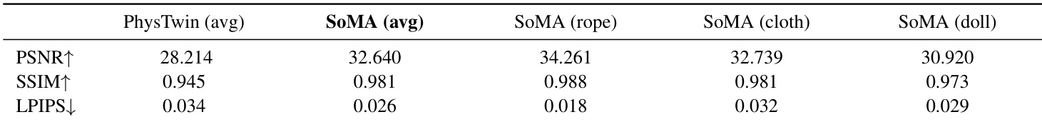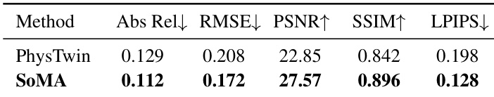 The authors evaluate SoMA against PhysTwin on image and depth metrics, showing SoMA achieves superior performance across all measures. Results indicate SoMA produces more accurate visual reconstructions and geometric consistency, particularly under complex robot-object interactions. This demonstrates its robustness in real-to-sim simulation compared to physics-based differentiable simulators.