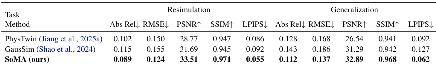 The authors use SoMA to simulate deformable objects under robot manipulation, showing it outperforms PhysTwin and GausSim in both resimulation and generalization tasks across image and depth metrics. Results show SoMA maintains stable, accurate dynamics over long horizons and adapts well to unseen actions, while baselines exhibit increasing error or structural collapse. The method’s robustness stems from its interaction-aware design and multi-resolution training, enabling reliable simulation even under complex, self-contact-heavy scenarios.
