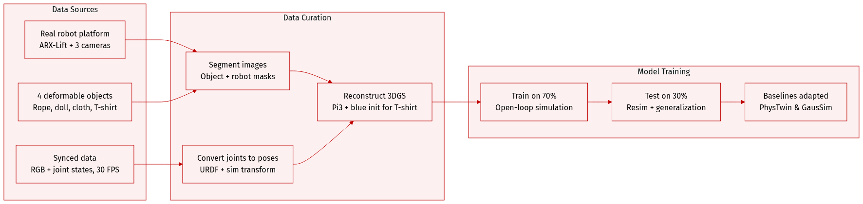 • The authors collect real-world robot manipulation data on an ARX-Lift platform, featuring four deformable objects: rope, doll, cloth, and T-shirt. Each object has 30–40 sequences, with 100–150 frames per sequence, captured at 640×480 resolution and 30 FPS alongside synchronized robot joint states. Datasets are split 7:3 into training and test sets.