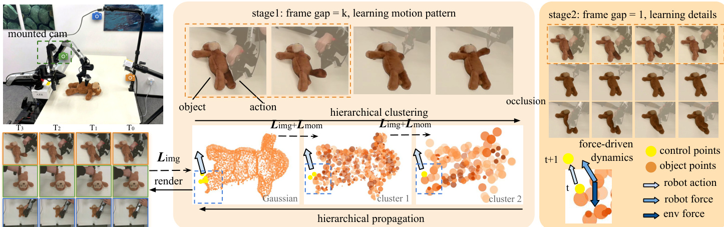 • It proposes robot-conditioned dynamics modeling and force-driven updates on Gaussian splats to ensure kinematically and physically consistent interactions, even under partial occlusion, combined with multi-resolution training and blended supervision to maintain stability over extended manipulation sequences.
