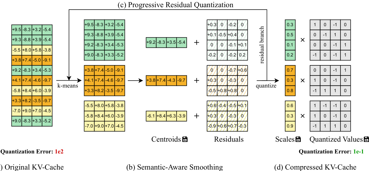 This multi-stage approach allows the model to capture coarse semantic structure in early stages and fine-grained variations in later stages, leading to diminishing but cumulative reductions in quantization error. As shown in the figure, the quantization error drops from 1e2 in the original cache to 1e−1 in the final compressed representation, demonstrating the efficacy of the progressive refinement.