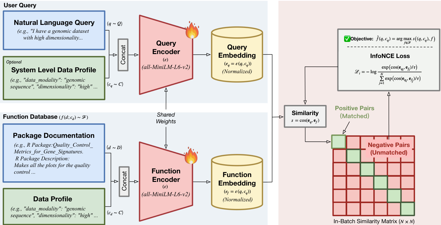 The core of the method utilizes a bi-encoder architecture with shared weights, initialized from a pre-trained sentence transformer. The authors define the shared encoder network as ε()\varepsilon(\cdot)ε(), which maps input texts into a shared vector space. For the query side, the system concatenates the natural language request qqq with the query-side data profile cqc_qcq to generate a query embedding eq=ε([q;cq])\mathbf{e}_q = \varepsilon([q; c_q])eq=ε([q;cq]). Similarly, for the function database, each candidate function is represented by its documentation ddd and its inherent data profile cdc_dcd, resulting in a function embedding ef=ε([d;cd])\mathbf{e}_f = \varepsilon([d; c_d])ef=ε([d;cd]). The relevance score is computed using cosine similarity between these representations: