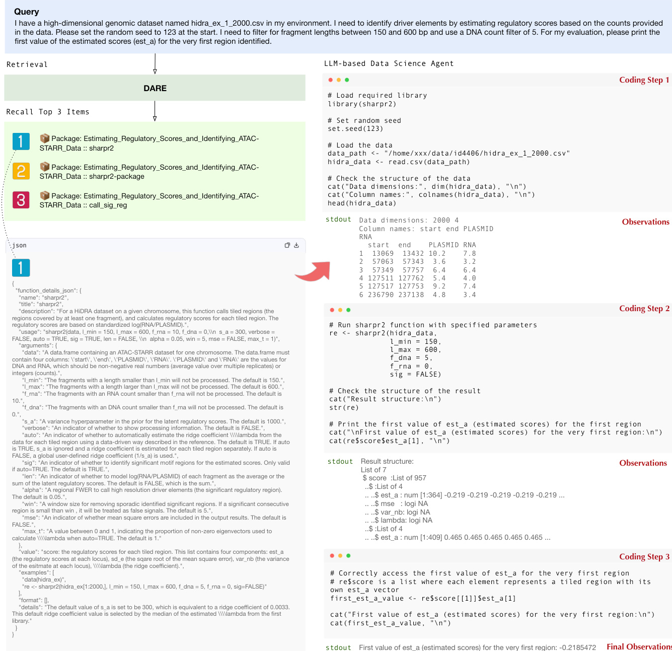 To facilitate end-to-end statistical analysis, the retrieval module is integrated into an LLM-based agent named RCodingAgent. The agent operates by first invoking DARE to retrieve candidate R packages and functions that satisfy both analytical intent and data compatibility constraints. The retrieved functions are returned with structured metadata, including argument specifications and usage examples, which are injected into the LLM context. This enables the agent to perform iterative reasoning, tool retrieval, and R code generation. The workflow demonstrates how the agent processes a user query, retrieves the top relevant functions, and executes coding steps to produce final observations.
