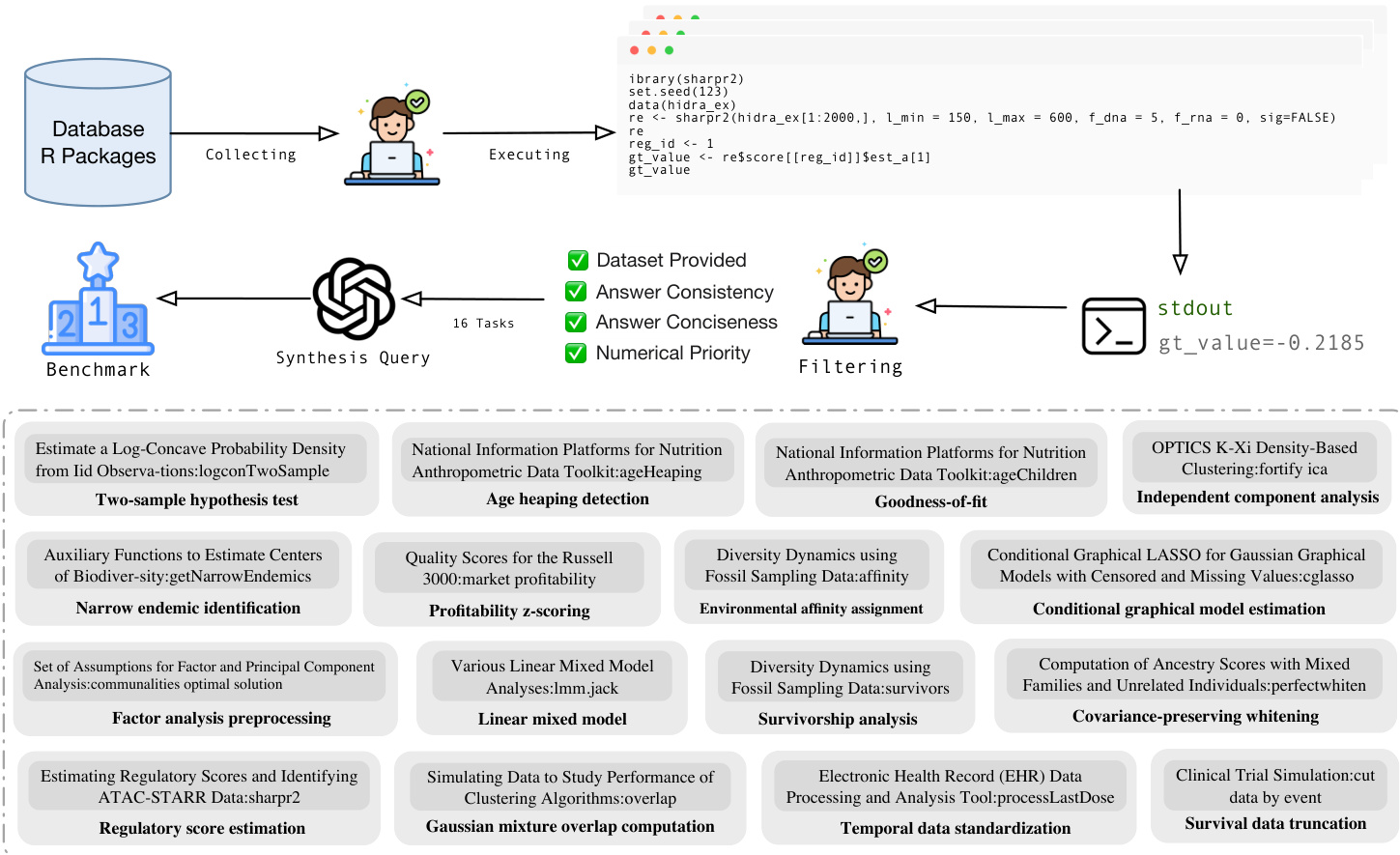 The system is evaluated using a benchmark pipeline that collects R packages and synthesizes queries to test retrieval and execution capabilities. The pipeline involves collecting functions from a database, executing code to generate ground truth outputs, and filtering results based on criteria such as dataset provision, answer consistency, and numerical priority. The benchmark covers a diverse range of statistical tasks, including hypothesis testing, density estimation, and data transformation, ensuring comprehensive evaluation of the retrieval system's ability to handle complex data science workflows.